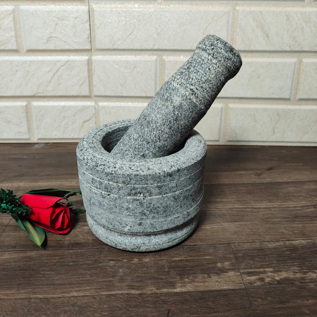 Say goodbye to bulky electric mixers or food processors while discovering the immersive cooking process of the Khalbatta. Its round shape and well-balanced design make it easy to crush, grind, and mix a variety of ingredients with minimal effort. From Indian masalas to guacamole, pesto, and chutneys, this natural stone mortar will help you enhance flavor and texture in every dish. The textured surface of the basalt ensures effective grinding, unlocking the rich aromas of spices and herbs.